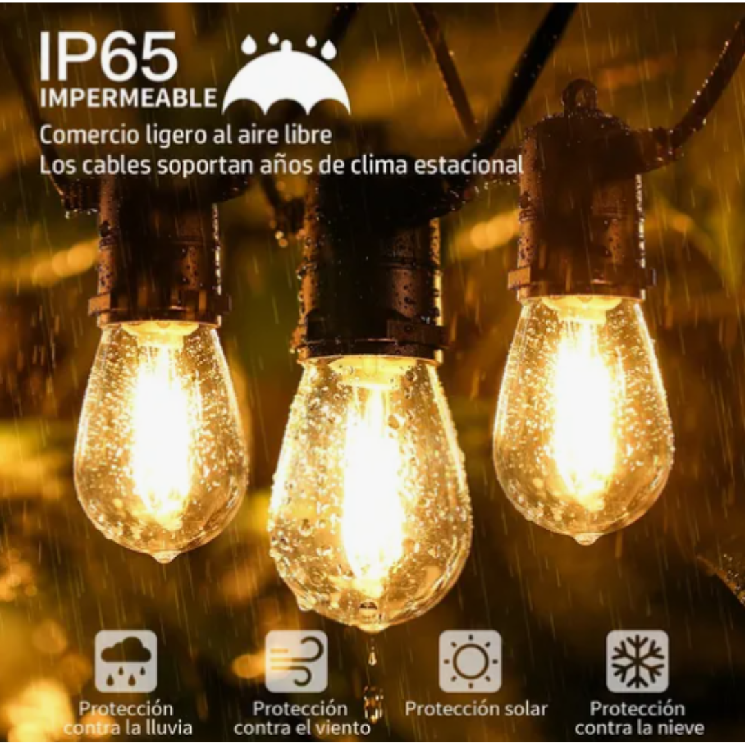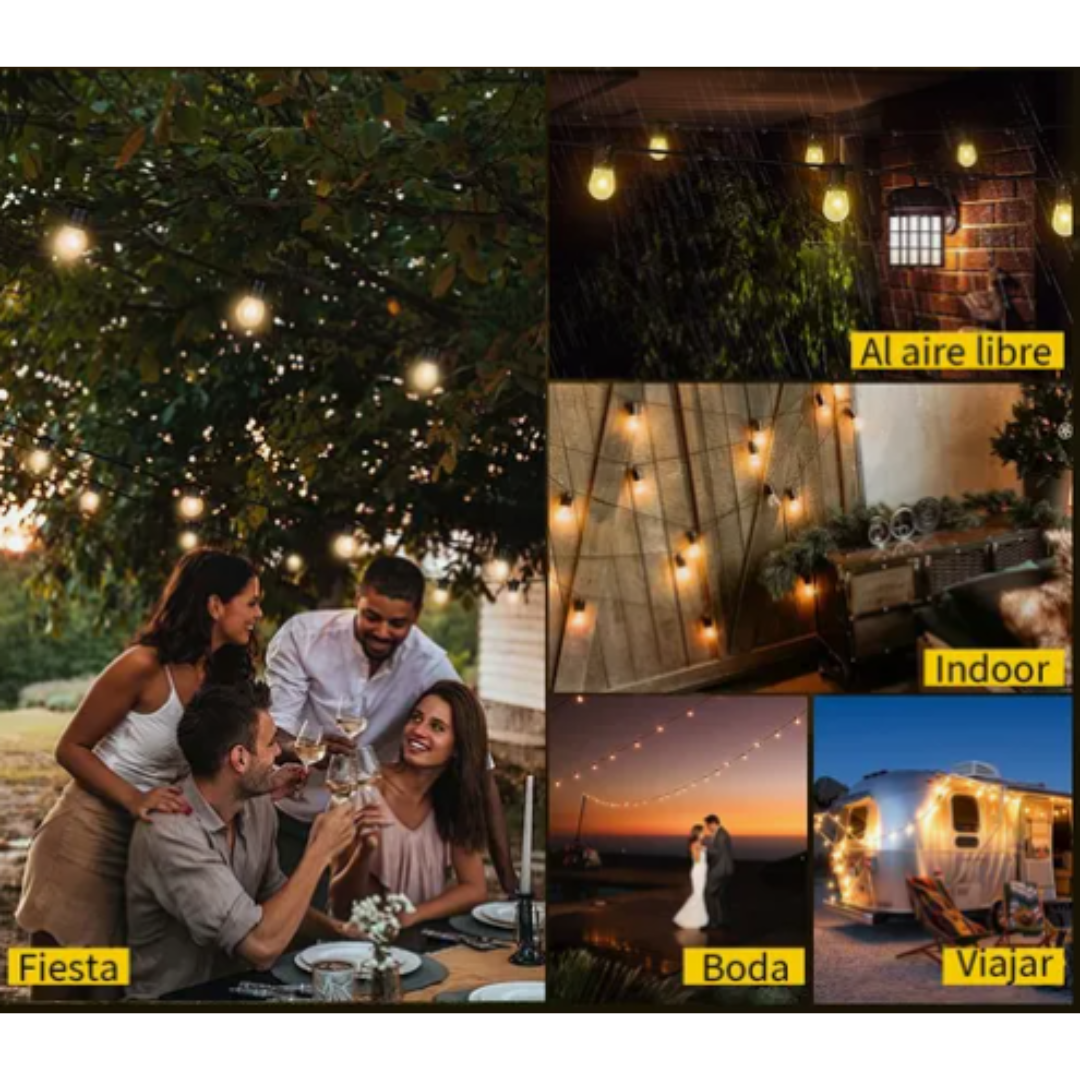 Luces Guirnalda Solar 10mts Led Cálido, dale a tus espacios como terrazas un estilo elegante y agradable a la vista tipo Vintage.