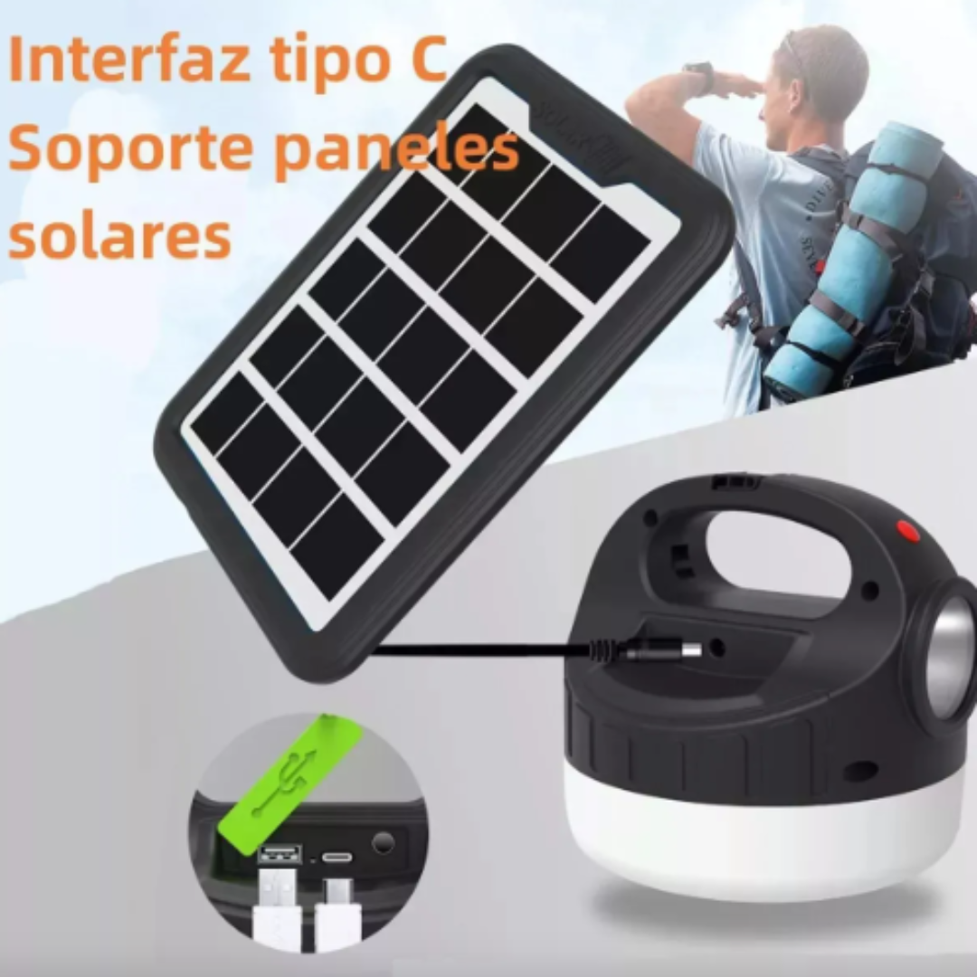 Equipado con un panel solar portátil, se puede cargar de 6 a 8 horas durante el día y puede seguir iluminándose durante suficiente tiempo durante la noche, lo cual resulta muy útil para emergencias al aire libre.