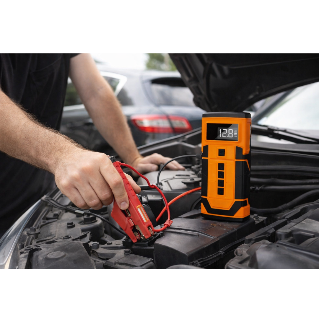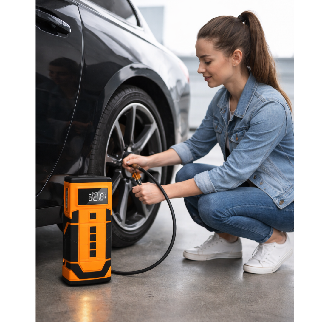 Potente arrancador de batería portátil multifuncional, diseñado para emergencias en carretera y mantenimiento básico del vehículo. Este dispositivo permite arrancar autos con batería descargada, inflar neumáticos y cargar dispositivos electrónicos, todo en un solo equipo compacto.