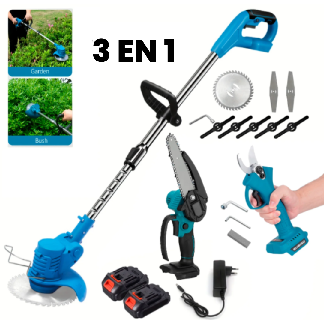 1 Corta Pasto, Orilladora, Desbrozadora inalámbrica más accesorios 1 Motosierra Inalámbrica 6″ 1 Tijera de Podar Inalámbrica